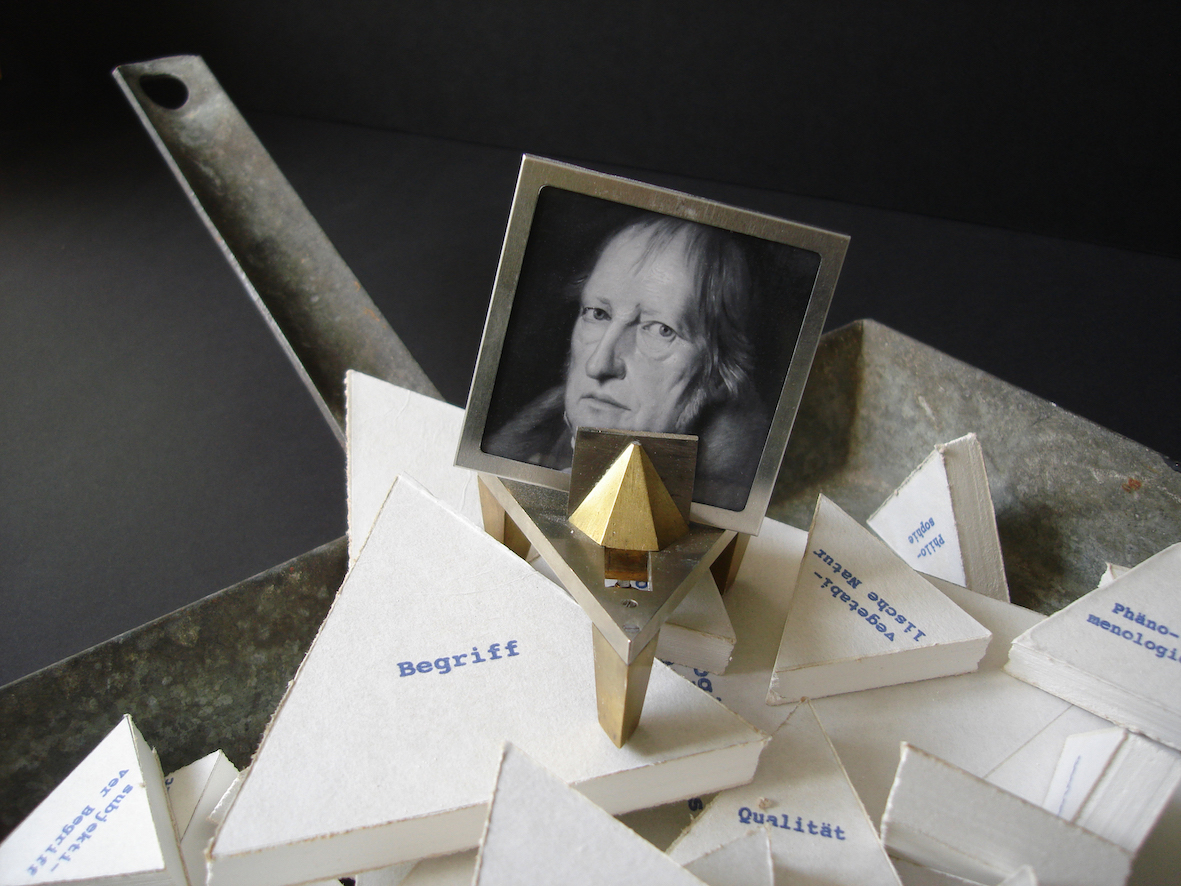Hegel’s System der Wissenschaften, 2015, altes Kehrblech, beschriftete Gipskartonplatten, Unruhwaage, Bild von G.W.F. Hegel,55 x 38 x 16 cm (variabel)